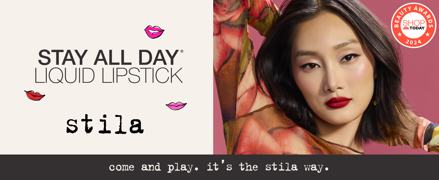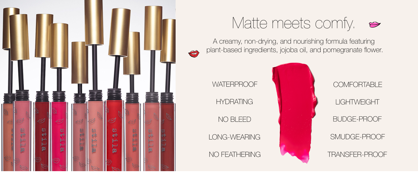 Now, Stila’s cult fave 12-hour Stay All Day® Liquid Lipstick is better than ever with a matte-meets-comfy formula infused with a nourishing complex of plant-based ingredients like jojoba oil and pomegranate flower extract. The result is a creamy, lip-enhancing formula for smoother, fuller-looking lips.  In a range of color-rich shades from neutral to bold that won’t bleed, feather or smudge. Budge-proof, transfer-proof and waterproof.