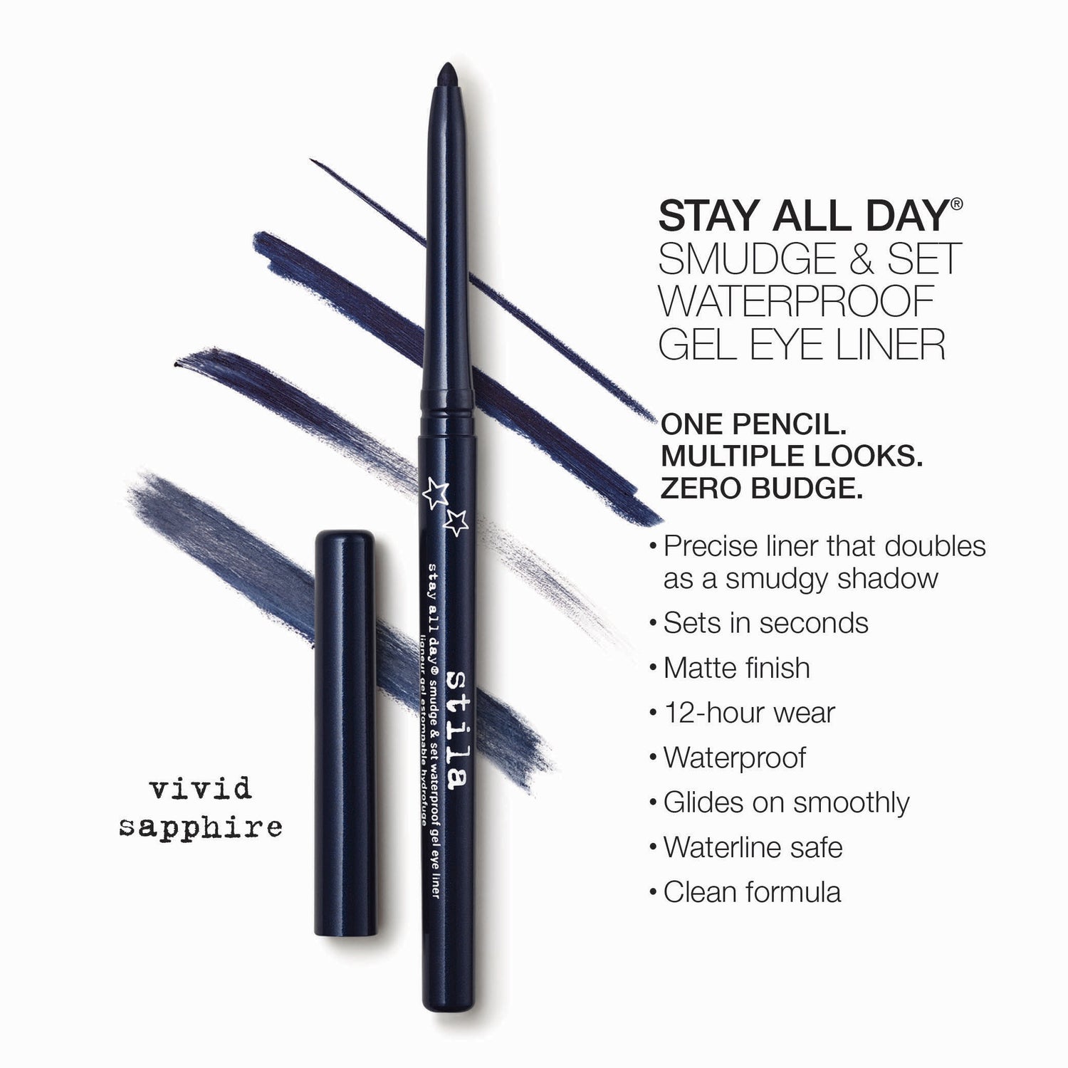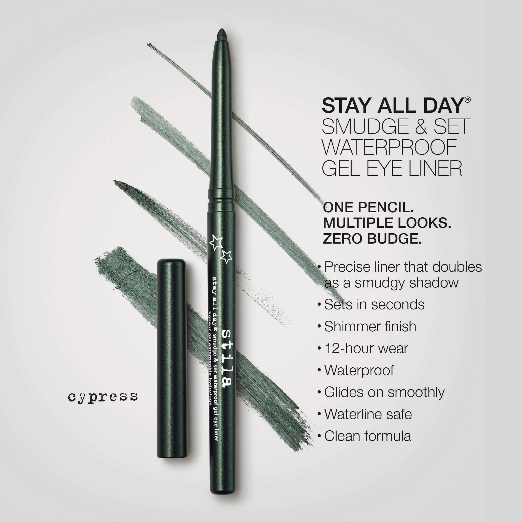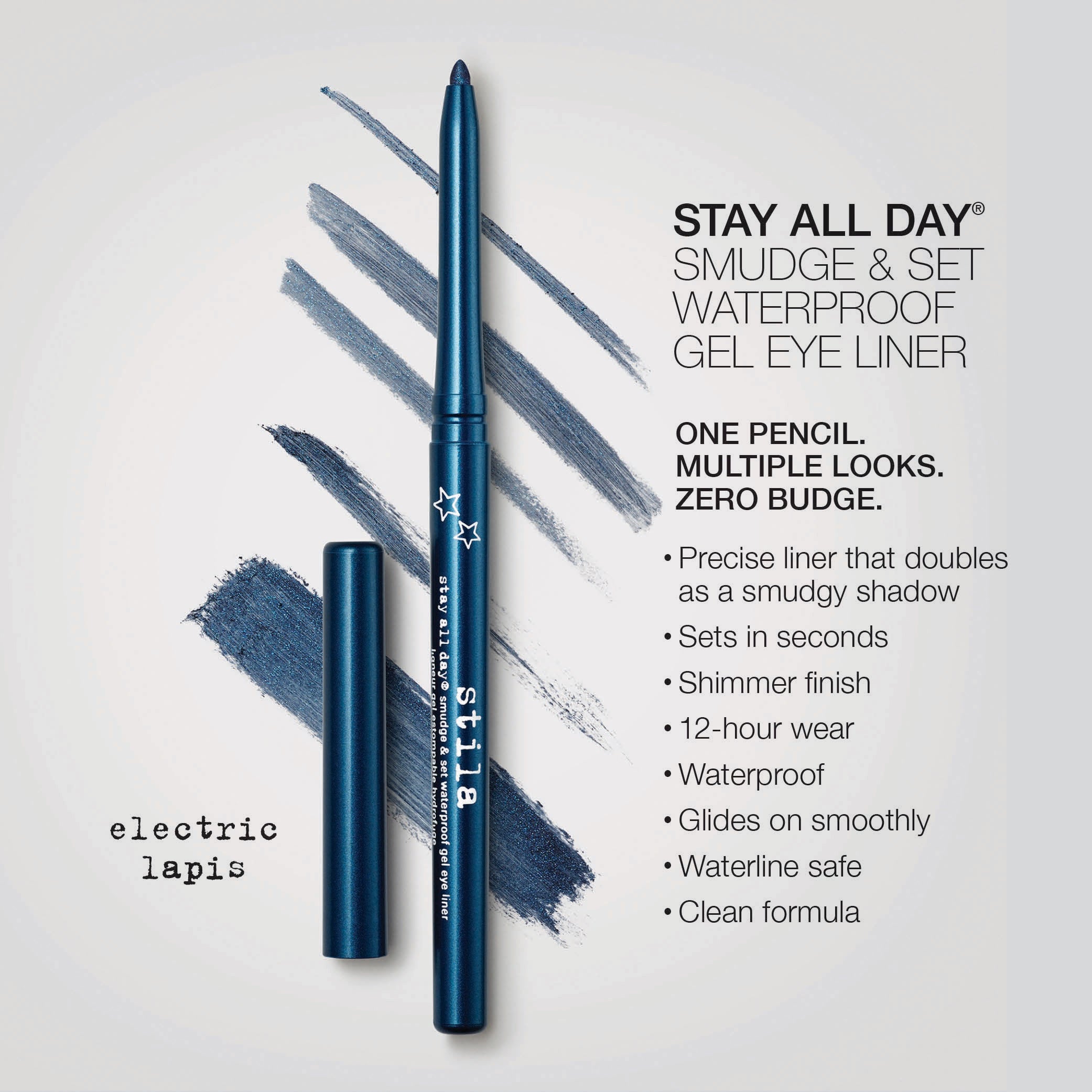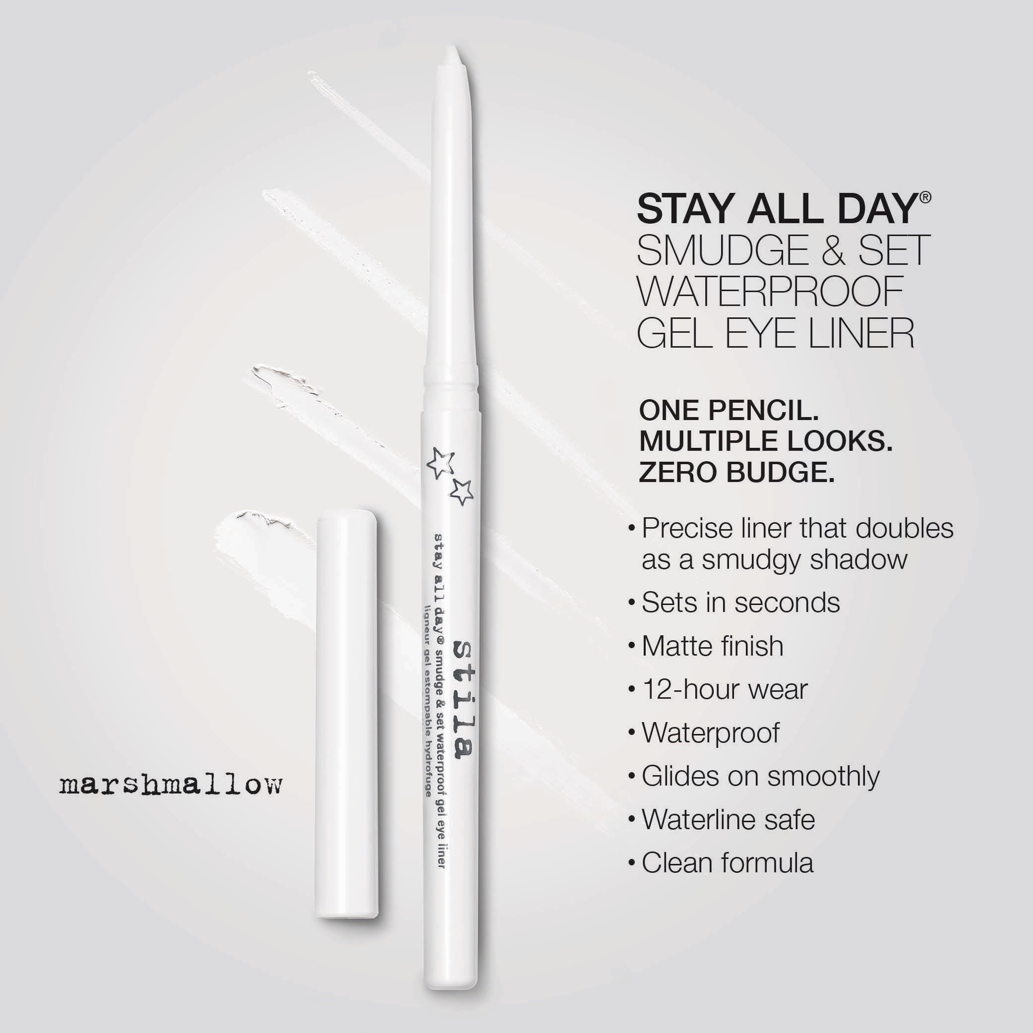 The perfect line meets the perfect smudge in this ultimate no-budge pencil. A gel-based formula allows for effortless play and no-skip application as you create multiple eye looks – lining, smudging and blending into a shadow for versatile effects.  Perfect for adding depth and definition to waterline, too. Endless play from one go-to pencil sets in seconds and delivers 12-hour color-rich, fade-proof and sweat-proof wear.  Waterline-safe and waterproof. Ophthalmologist-tested.